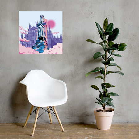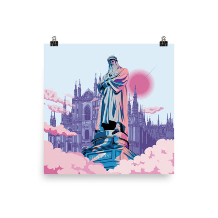 La statua raffigurante Leonardo Da Vinci si erge in Piazza della Scala a Milano per celebrare il genio del grande Maestro, che ha lasciato in eredità alla città la cultura figurativa lombarda di fine Quattrocento e inizio Cinquecento. La scultura riprende lo stile fumettistico, rendendo l'illustrazione moderna e creativa, con evidenti richiami vaporwave.